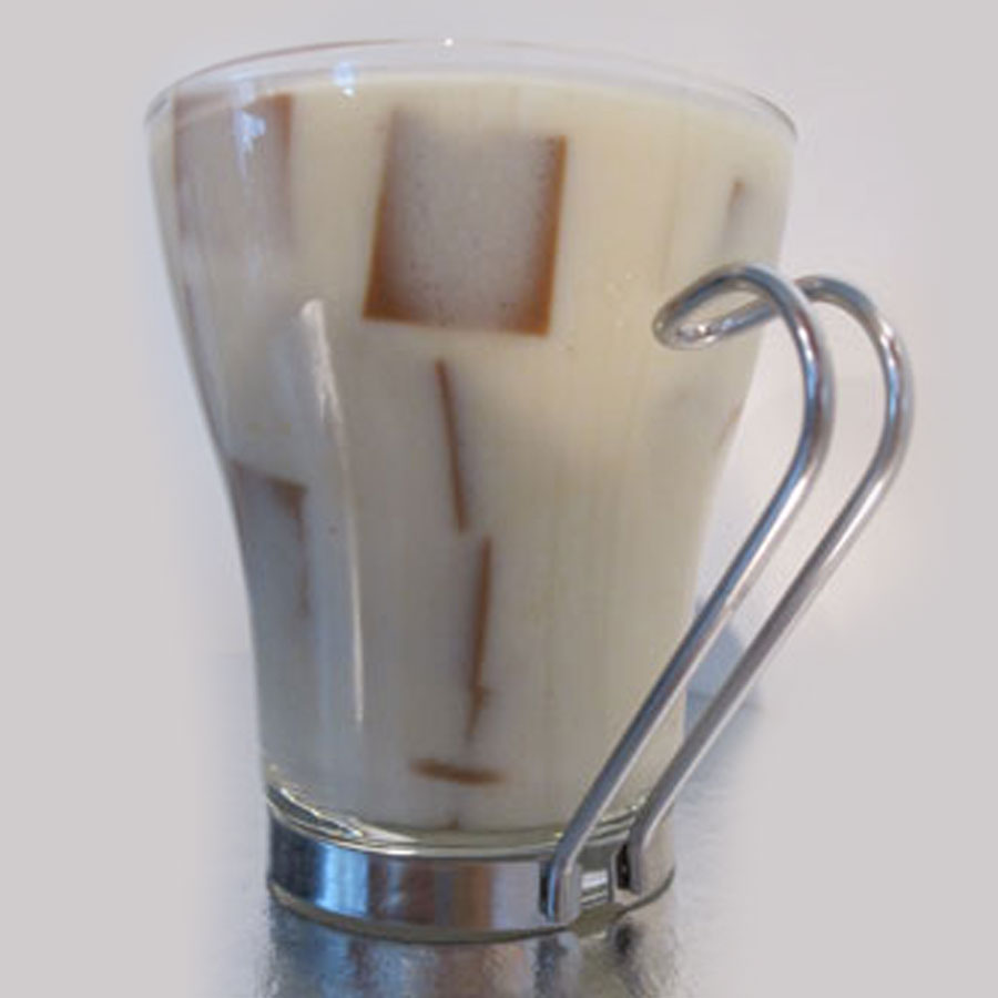 Add the coffee to 3 tblsp of coconut milk, and stir well. Set aside. In a pot, add the gelatin powder and sugar to the remaining 1c coconut milk. Boil this mixture at medium heat until the gelatin powder is completely dissolved. Stir in coffee milk mixture and boil for a minute before turning off the heat. Using the tip of a fork, scratch the surface of the cooled and hardened chocolate layer lightly. Pour the liquid coffee gelatin over the chocolate layer, gently and slowly, so that it flows smoothly and evenly over the top of the chocolate layer. Allow to chill in the refrigerator. Cut into cubes and serve in milk, cold Nightly Beauty, or chilled coffee.